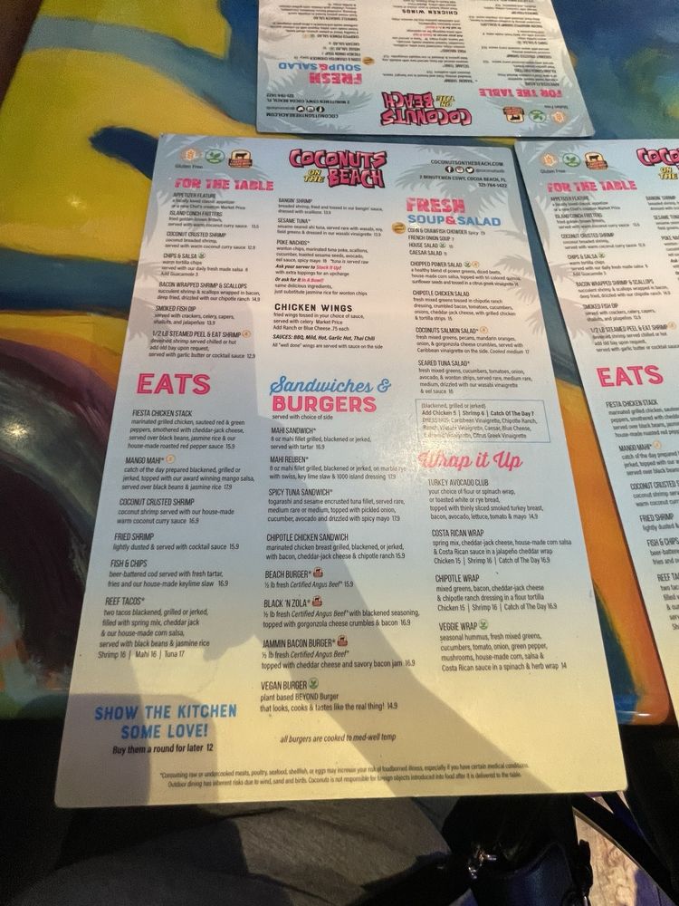 Coconuts On The Beach is a vibrant tiki bar located in Cocoa Beach, FL. Offering a casual, touristy atmosphere with live music, this veteran-owned establishment is popular for its Happy Hour specials and full bar. The menu features a variety of options, including Bacon Wrapped Shrimp & Scallops, Bangin' Shrimp, and Coconut Crusted Shrimp for starters. For main courses, try the Coconut Crusted Shrimp, Fajita Style Chicken, or the classic Fish & Chips. Customers praise the ambience, ocean view, and excellent service at Coconuts On The Beach. Don't miss out on the Mahi Reuben sandwich, the Mango Mahi, or the BBQ Chicken Wings. Enjoy the beachy vibes, refreshing drinks, and delicious seafood dishes at this lively hotspot.